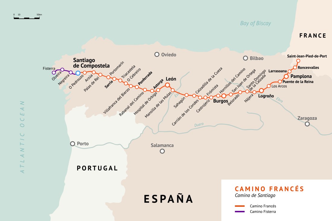 This is the route from St. Jean to Santiago. The identified towns are suggested overnight stops in the John Brierly guidebook.
