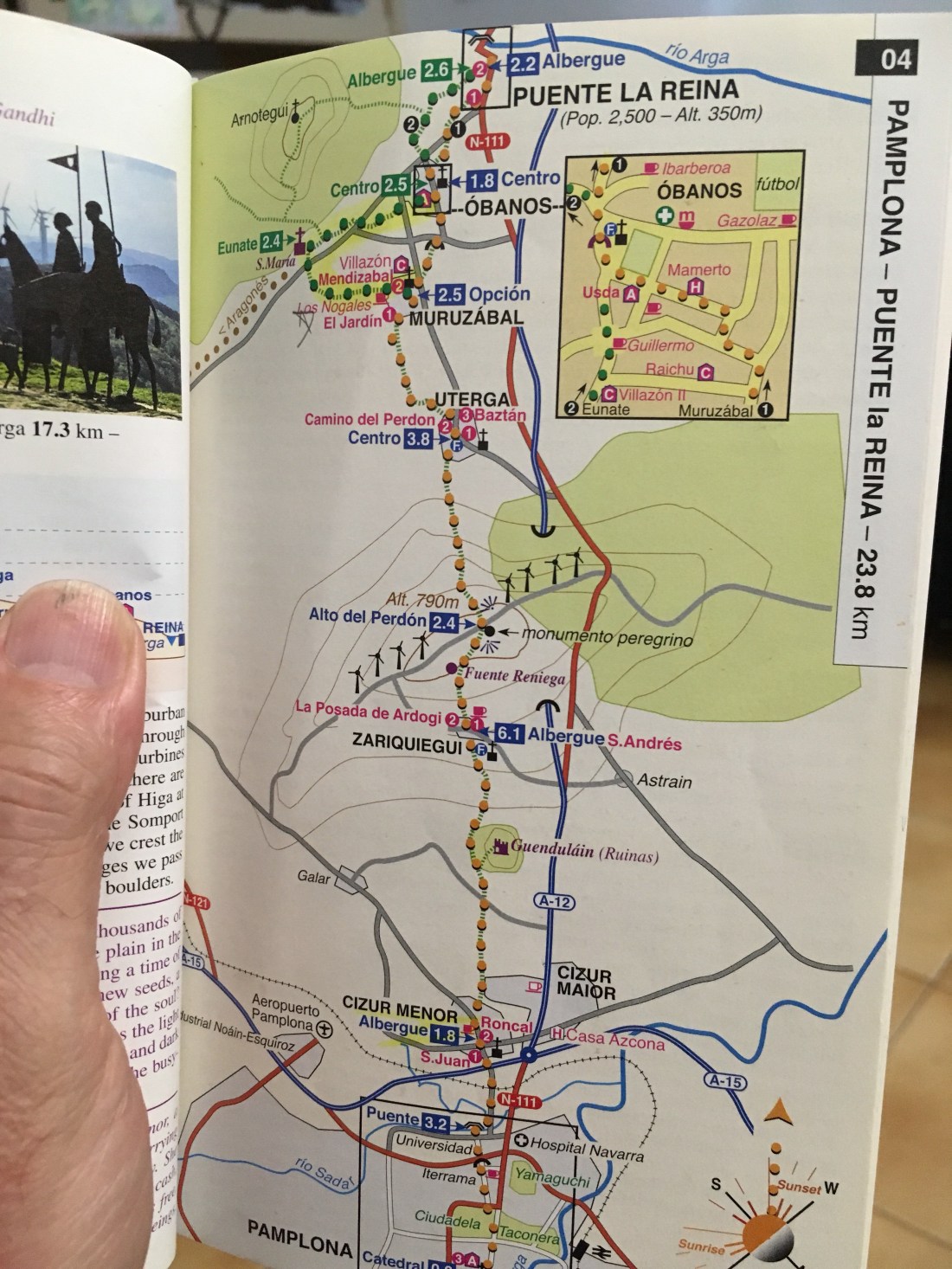 We got up at 6:00 AM this morning at the alburgue in Zariquiegui, packed up, ate breakfast at the local cafe and started walking at 7:00 AM. I had a tortilla, which is a quiche, with potatoes and cheese, and a banana. I also took an apple for a mid morning snack. This is the map of the walk today from Zariquiegui to Puente La Reina.