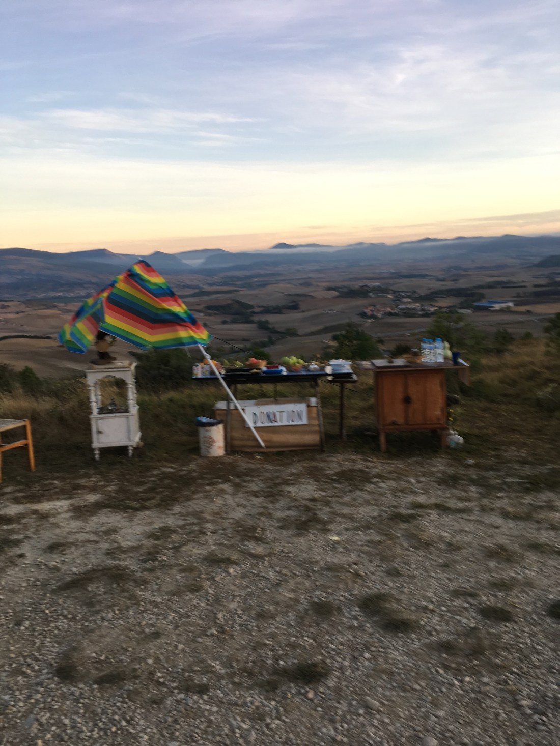 This is a donativo snack stand about halfway up to Alto del Perdon. You take what you need and pay what you can.