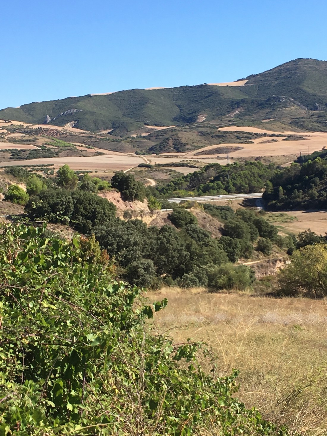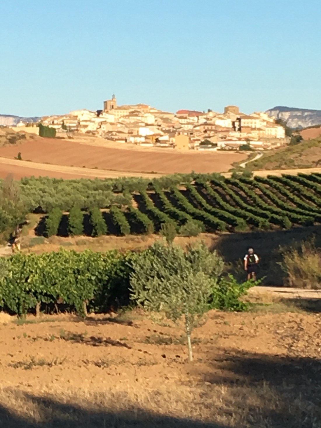 This is the elephant walk, nose to tail, pilgrim style. The town in the distance is the second town we walked through, Cirauqui. I stopped here and had an apple and a yogurt.