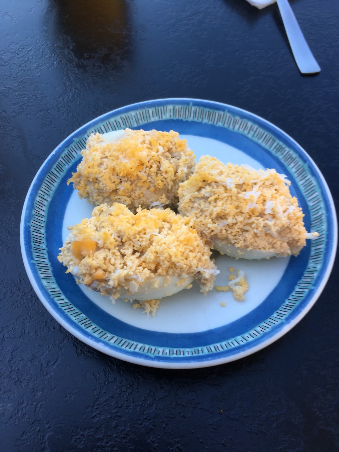 This is a plate of deviled eggs with tuna.
