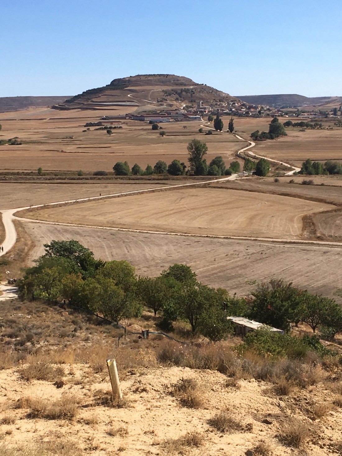 This is a view from the ridge west of Castrojeriz lookin back east at Castrojeriz and the trail from Castrojeriz up to the top of the ridge.