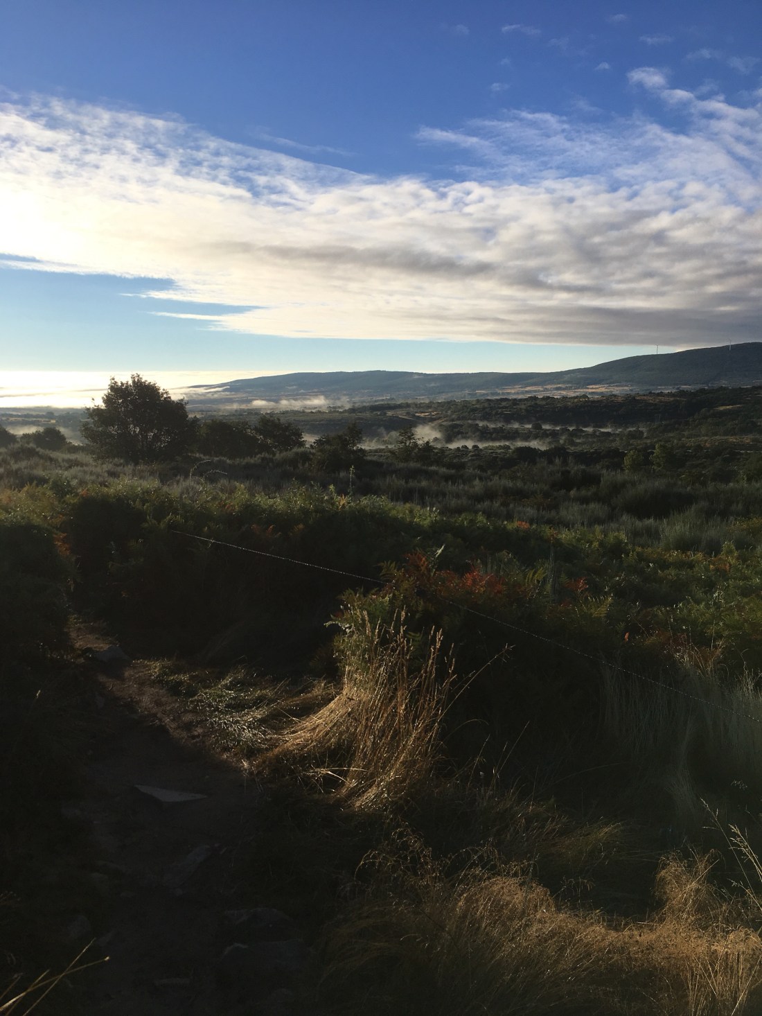 Today we walked from Rabanal del Camino to Molinaseca. It is almost 30 kilometers and takes us uphill to the highest point on the Camino, Cruz de Ferro, or the Cross of Iron. And then almost 15 kilometers downhill to Molinaseca. This is a shot of sunrise outside Rabanal.