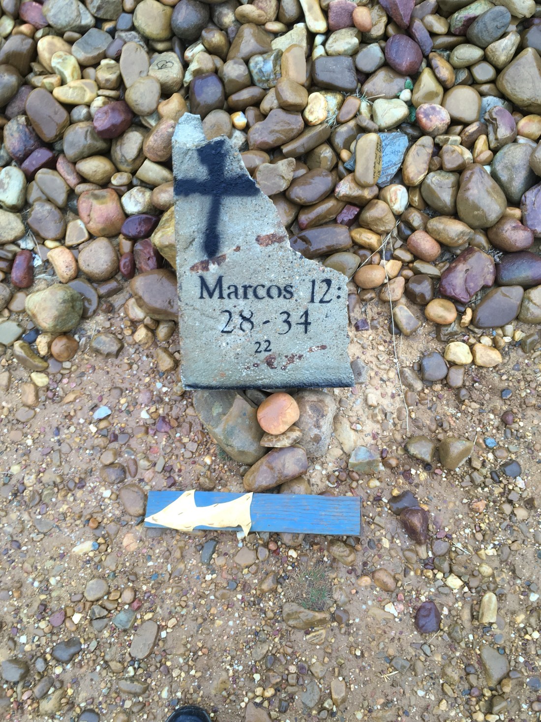 The yellow arrow is a Camino trail marker. The Bible verse, Mark, Chapter 12 verses 28-34 reads generally as follows: ” Of all the Commandments which is the most important? Love the Lord your God with all your heart, with all your soul and with all your strength. The second is love your neighbor as yourself.”