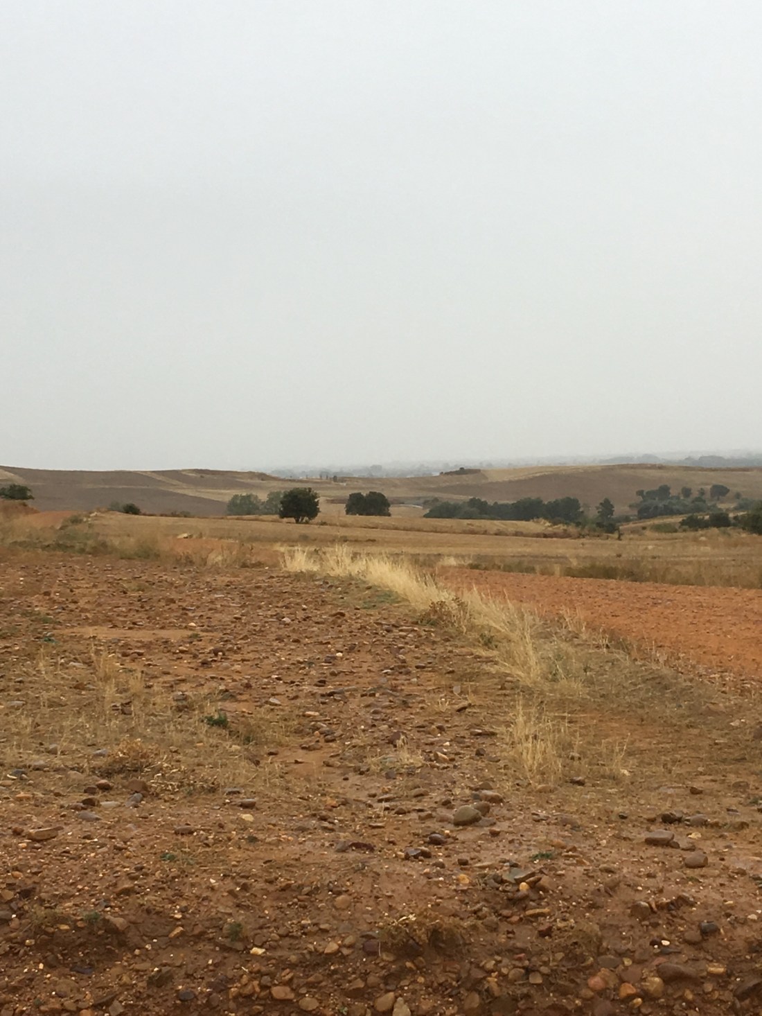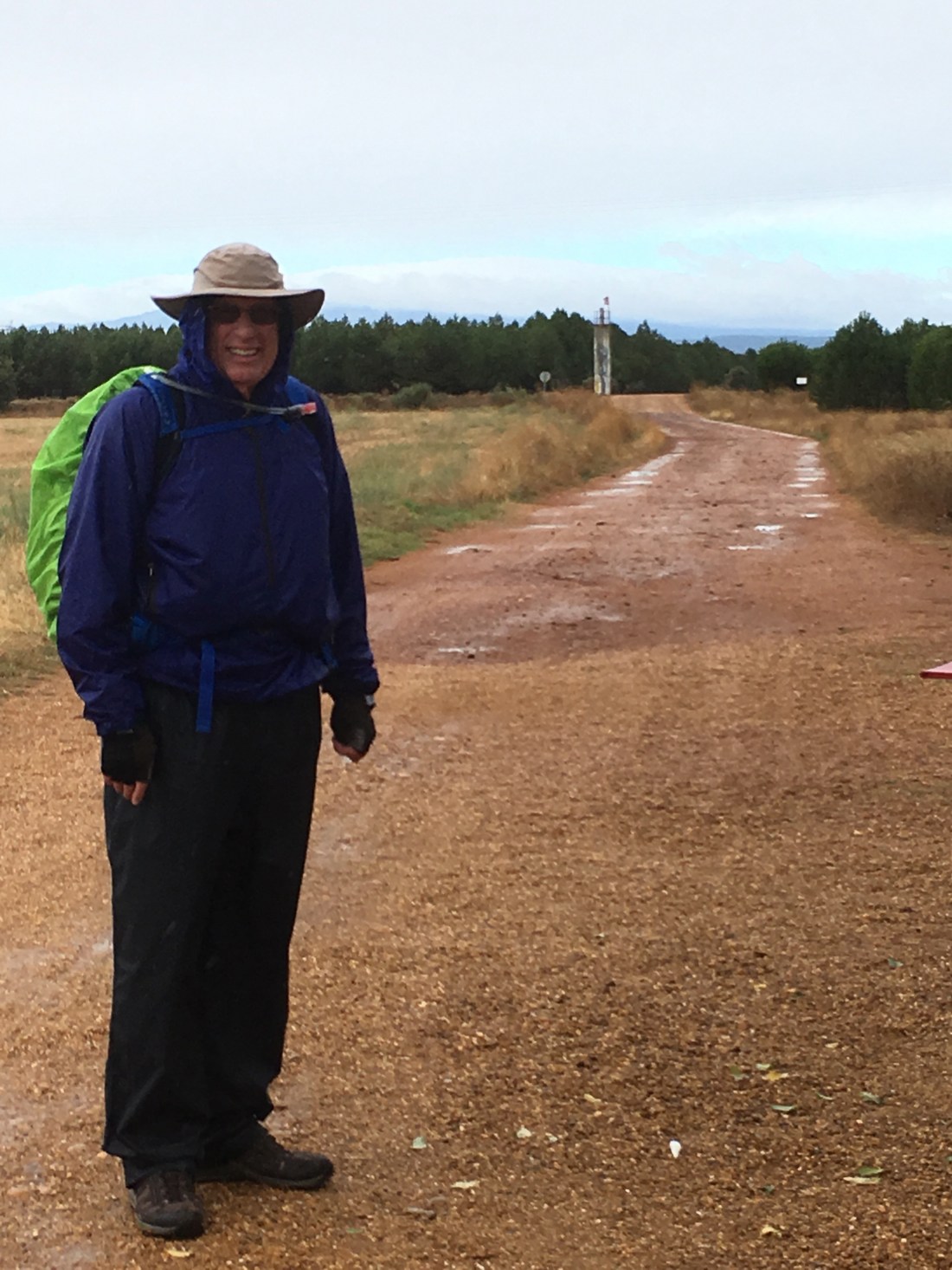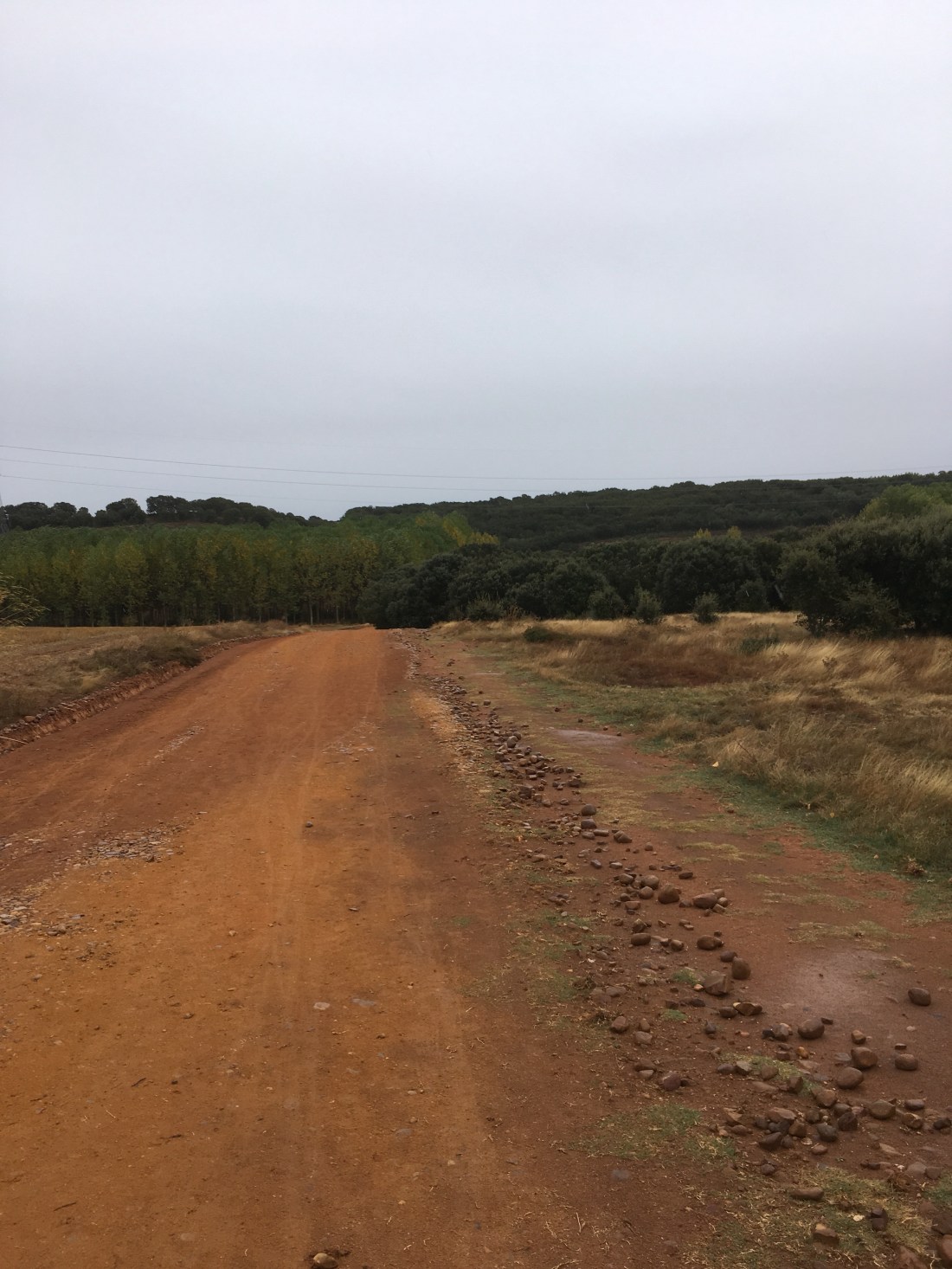 The rain gear worked well and I stayed relatively warm and dry. However, it takes a great deal of effort to walk into a 20 MPH wind and driving rain. It didn’t really rain hard. But it rained hard enough to make the 15 kilometer moderately uphill and into the wind hike to Astorga a put your head down and take one step at a time slog. This is a picture of the trail. It is not a great picture because it is so cloudy.