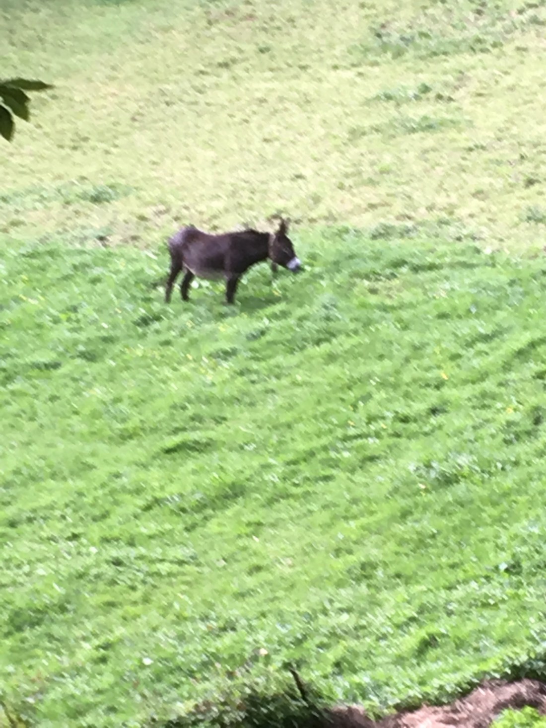 The Pilgrim donkey, Dondora, taking a coffee break in a meadow next to the Camino.