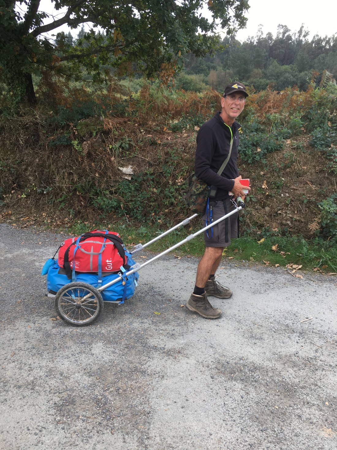 This guy is from Germany and his name is Hermann, Hermann the German. He made this contraption in his garage and has done the entire Camino hauling this cart behind him. He said that he carries at least two six packs of beer and camping equipment in the two bags on the cart. He wants to make sure he does not run short of beer πΊ on his Camino. You gotta hand it to this German for keeping his Camino priorities straight.
