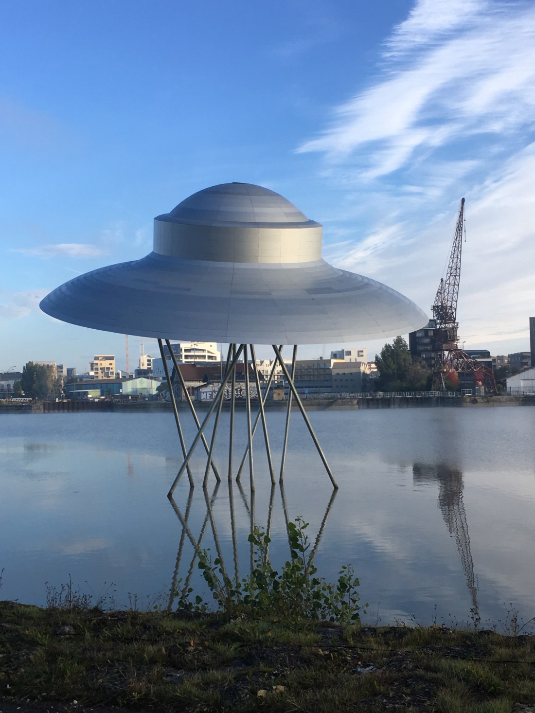 I got up at about 7:00 AM on Sunday morning, showered and dressed in the cleanest clothes I have, not exactly clean but the cleanest I have, and went for a walk along the canal in the back of the hotel where I am staying. Boy was I surprised when I found a flying saucerπΈ in the canal.