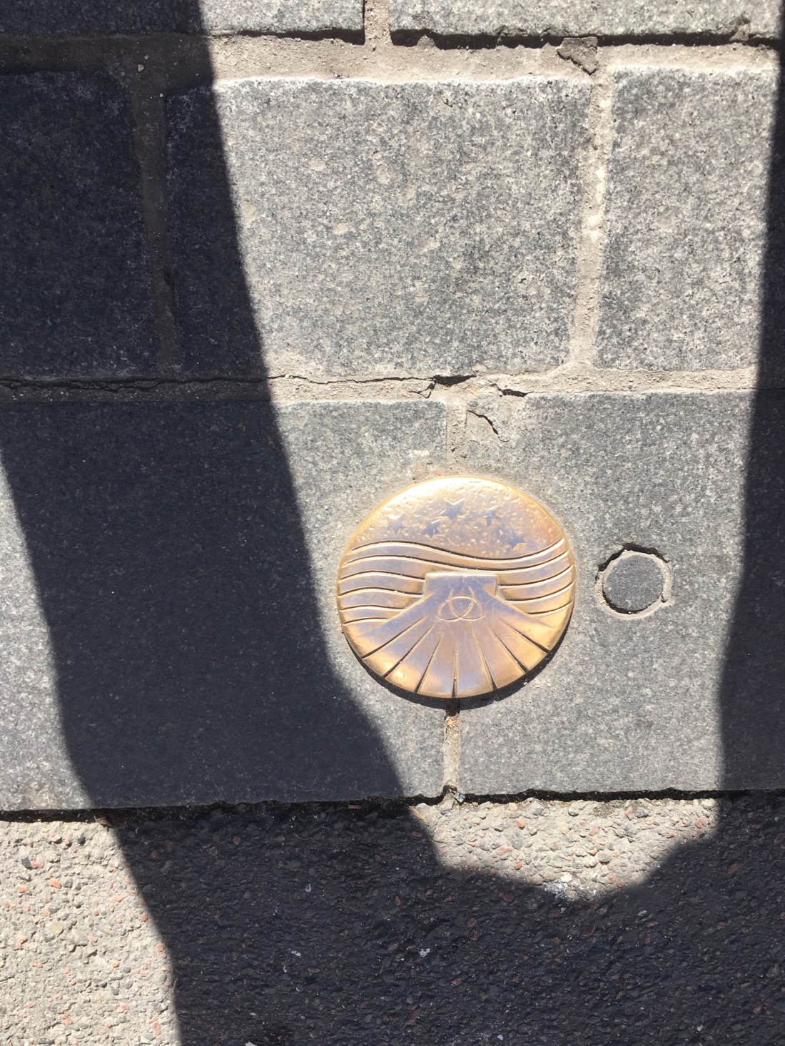 That is a scallop shell pavement marker for a Camino! Apparently one of the seven Caminos runs through Bordeaux. You can follow these scallop shell trail markers from Bordeaux to St. Jean Pied de Port and then on to Santiago. While I lost weight walking the Way in Spain, I imagine that you would gain weight walking the Way in France.