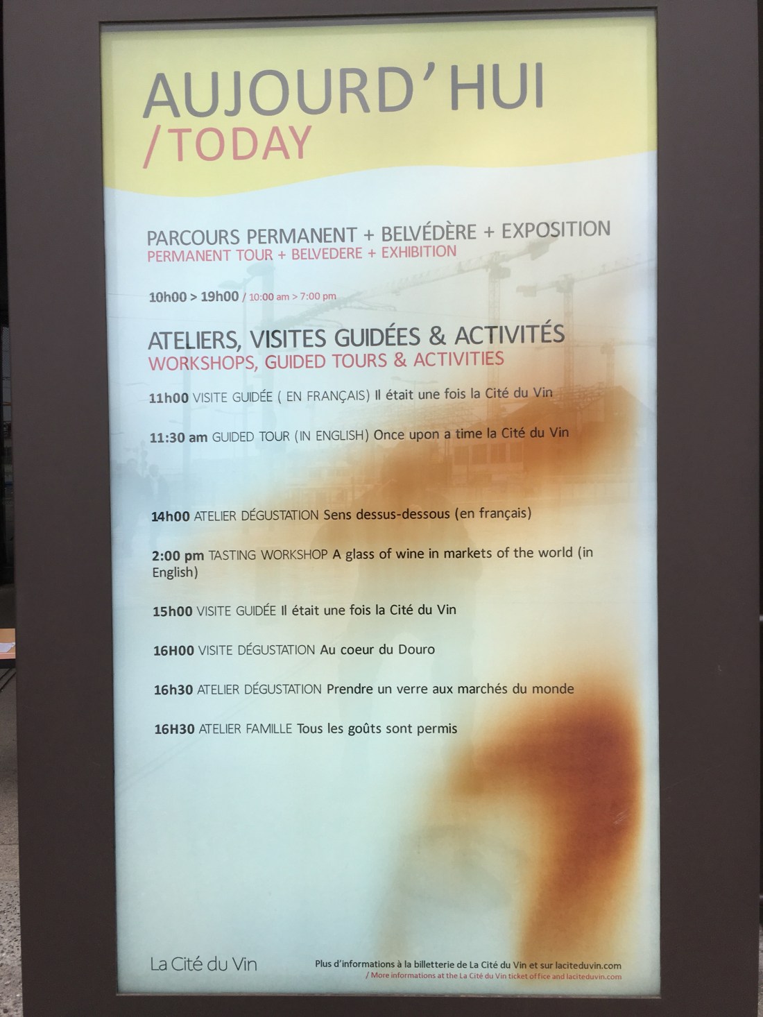Correct me if I am wrong, but I believe this sign says that Today there will be a guided tour of the museum in English at 11:30. I assumed that Today meant today and that 11:30 meant 11:30, so I took another stroll and came back a little before 11:30 anxious to start the museum tour in English that was clearly scheduled to begin at 11:30 TODAY!! I spent a considerable amount of time with the young man selling tickets at the entrance to the Wine Museum trying to convince him that he should sell me a ticket to the 11:30 museum tour in English. He spent a considerable amount of time trying to convince me that there was no 11:30 museum tour in English TODAY! He wanted to sell me a ticket for an 11:30 museum tour in French, but I declined his generous offer for obvious reasons. After much Gallic hemming and hawing he finally admitted that the Today on the sign actually meant yesterday and that they hadn’t gotten around to changing yesterday’s sign. So, he said I was actually 24 hours late for the 11:30 museum tour in English. I asked him if the Parisians put him up to this and he acted like he didn’t understand my question, although I know he did. You always need to be on your toes when you are dealing with these wiley Frenchies. I finally gave up and bought a ticket to the Wine Museum that included an audio guide in English. It turned out to be a great museum. I spent 4 hours there learning just about everything there is to know about wine and the Bordeaux wine region.