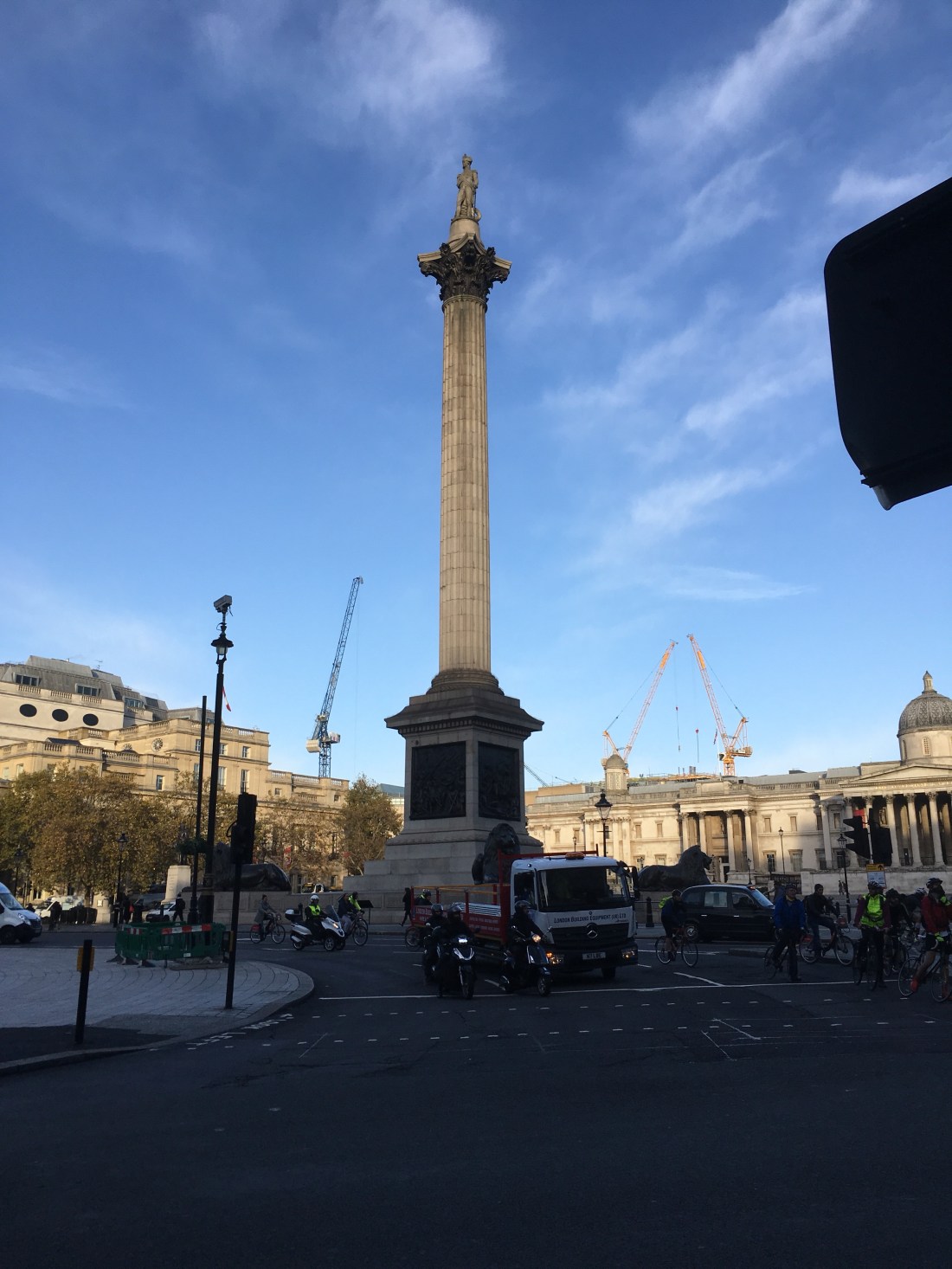 That is Lord Nelson on the top of the pedestal. What a thrill to be in Trafalgar Square in London.