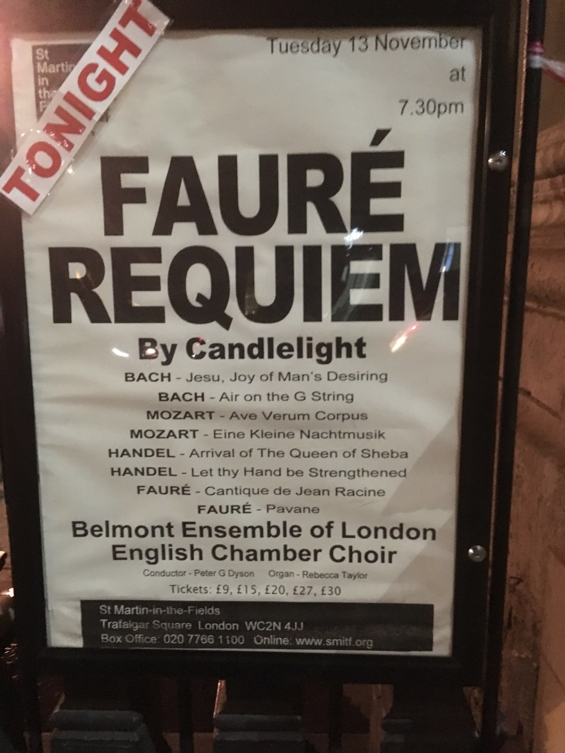 Well, St. Christopher saw the program and realized that “Jesu, Joy of Man’s Desiring” was on the program. This is one of his favorite songs. St. Christopher wanted to go to the concert and the guy at the ticket counter comped Abe because he is the greatest President there ever was or ever will be and he comped St. Christopher because he’s a saint. So I figured, why not. The Belmont Ensemble of London is a very accomplished 10 person string ensemble and the English Chamber Choir is a forty person choir. The Three Amigos loved the string ensemble, the choir and the venue!