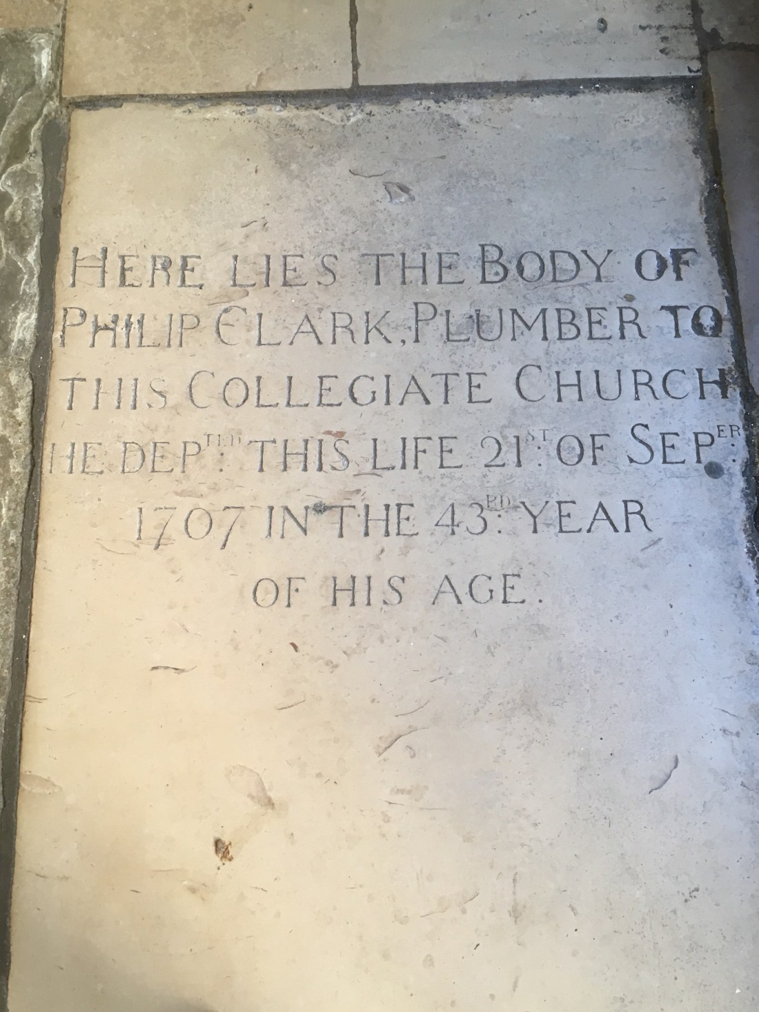 We then went outside and walked around the Cloisters of the Abby and inspected the memorial headstones in the walkway surrounding the Cloisters. You all know how hard it is to find a good plumber. Apparently, this guy was a very good plumber.