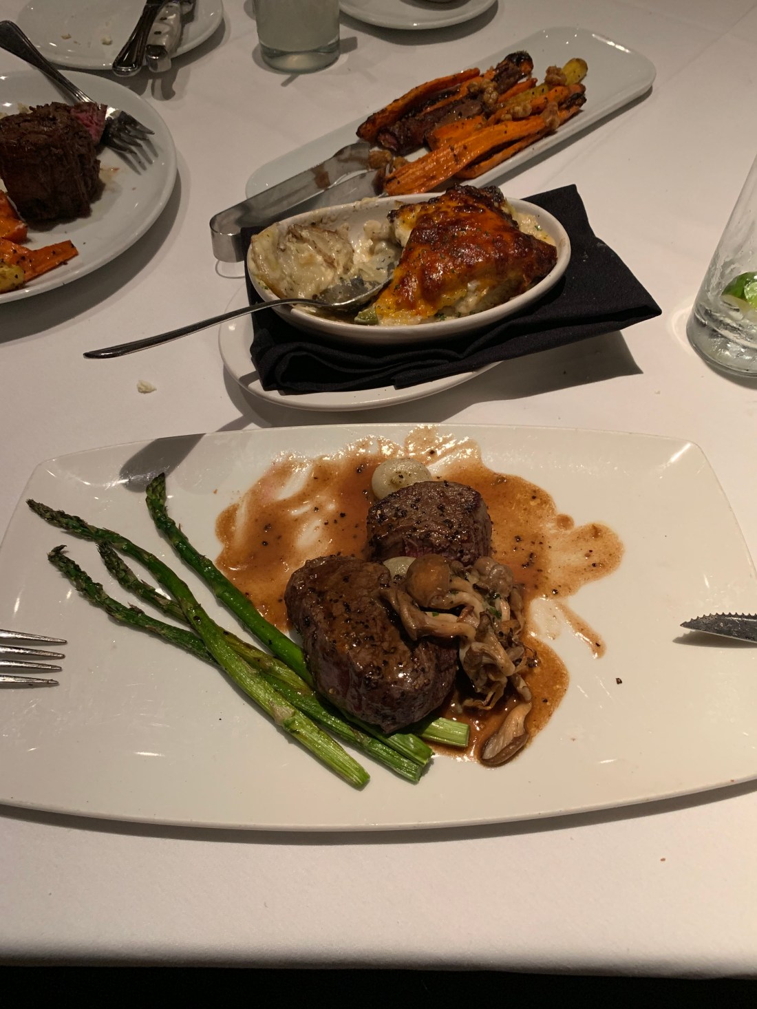 This is my scrumptious meal. I had fillet medallions with a peppercorn sauce, asparagus spears, oyster mushrooms, and cippoline onions. Jan and I shared an order of roasted heirloom carrots and au gratin potatoes. We exercised a great deal of self control and refused the waiter’s offer to bake us a special lava chocolate cake.