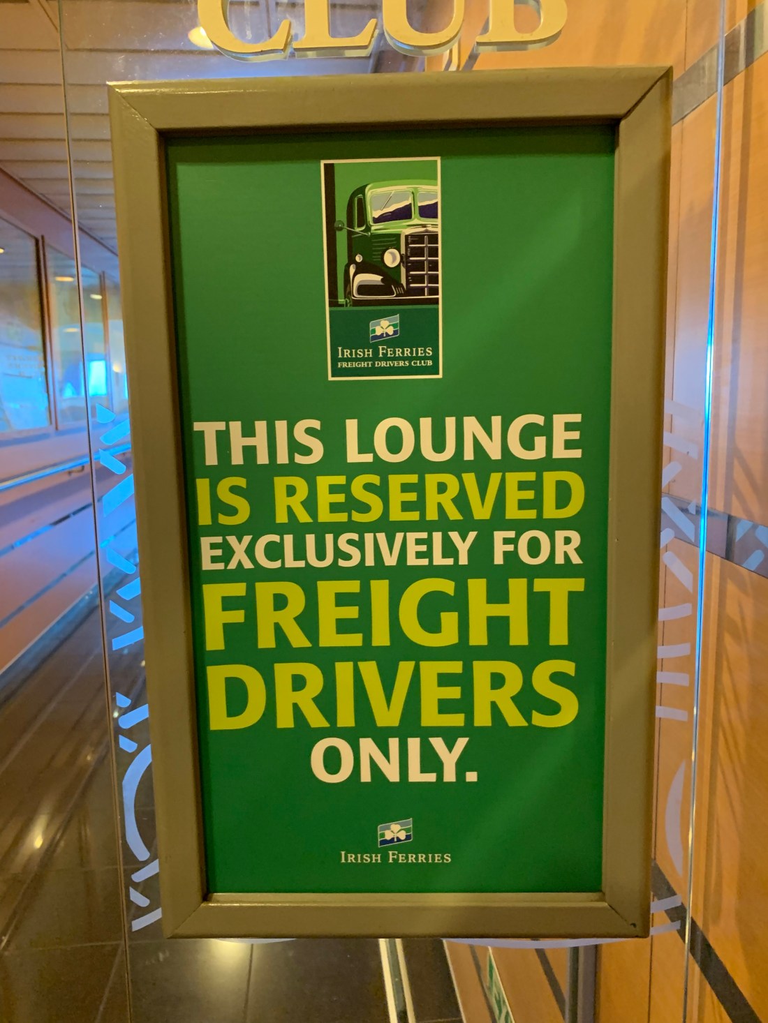 I boarded the 2:00 PM Irish Ferry bound for Dublin. There are various classes of service on this ferry. Because this is a car/truck and passenger ferry, they need a special lounge for the truck drivers. Kind of like a truck stop, except it is on a ferry.