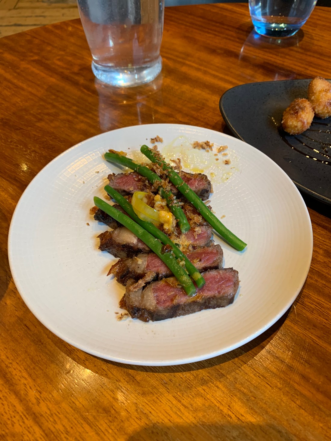 Sirloin steak with green beans.