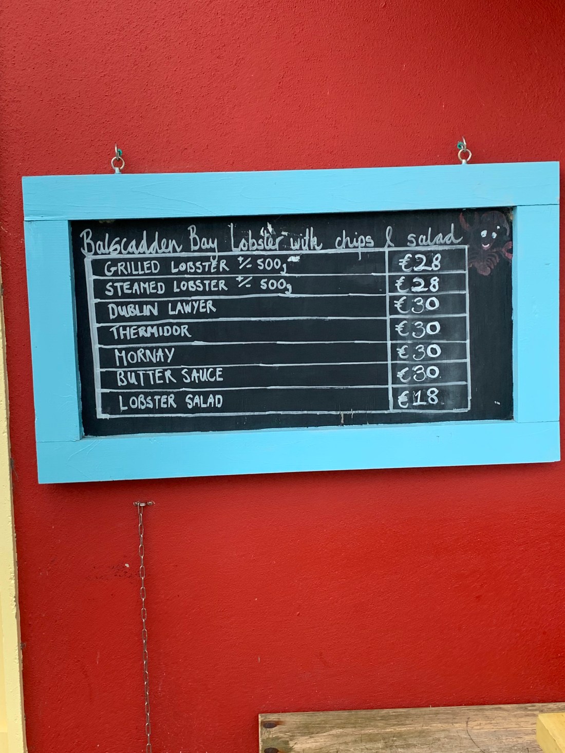 The specialty of the restaurant is lobster served a number of ways. This is the board listing the various ways the restaurant served lobster.