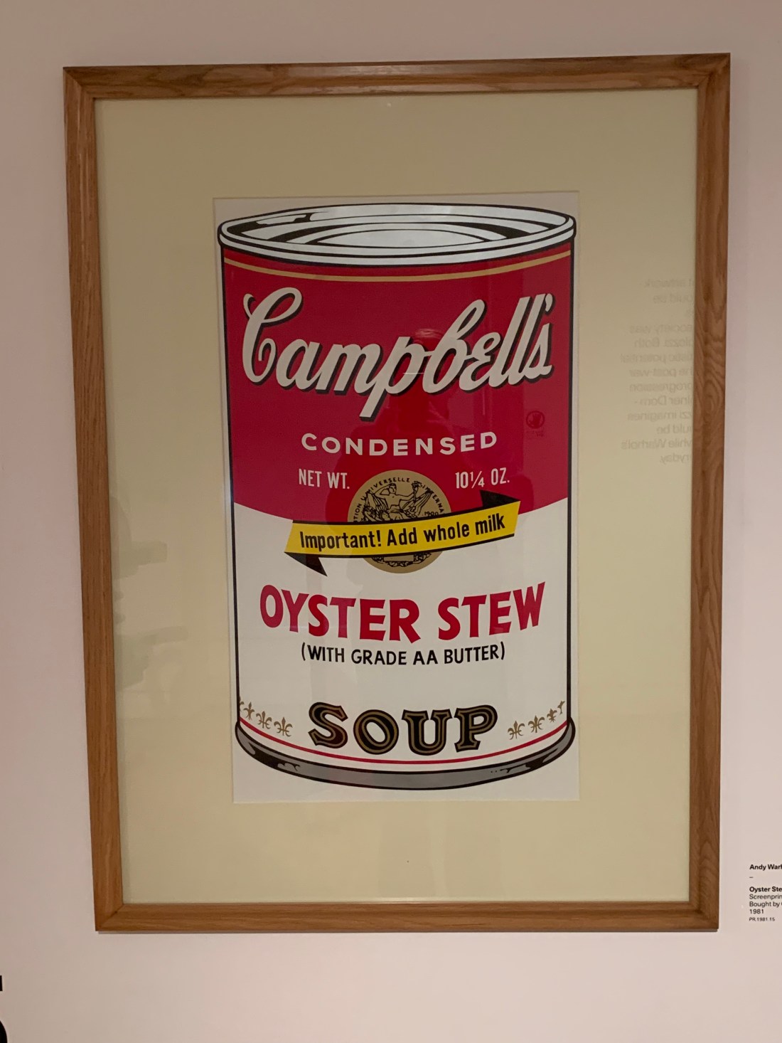 Right away I ran across one of those iconic Andy Warhol soup can paintings. Did you know that he did one of these paintings for every soup that Campbell’s produced, 32 in all. Andy had the same lunch for most of his adult life, a bowl of Campbell’s soup. Campbell’s was going to sue him for displaying and selling these paintings without licensing the image. But they quickly realized that they were getting millions of dollars of free publicity out of these wildly popular paintings and instead of suing Andy, they sent him a couple of cases of soup.