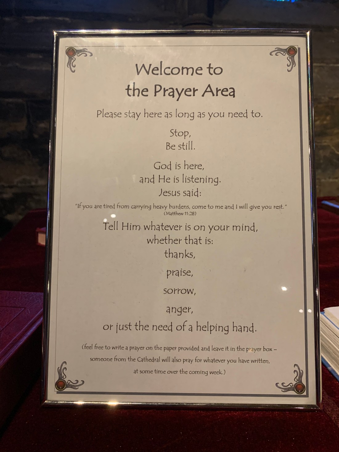 In the basement of the Cathedral there was a prayer station where you could write on a card the names of the people you want the church deacons to include in their daily prayers.