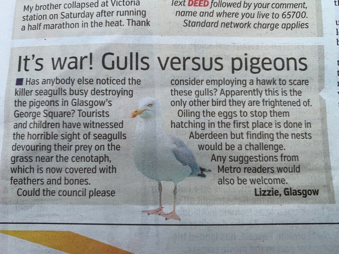 Hey Lizzie, how stupid are you? First off, pigeons are nothing more than rats with wings. Haven’t you noticed the white blotches all over the monuments and benches in George Square? The pigeons, and the people who feed the pigeons, are responsible for this mess. You are outraged that the seagulls are attacking, killing and eating the pigeons in the Square. Stop feeding the pigeons and they will stop hanging around the Square and maybe they will find a safer spot to eat their meals. With your breadcrumbs you are luring the pigeons into the Square and creating a veritable pigeon buffet for the seagulls.