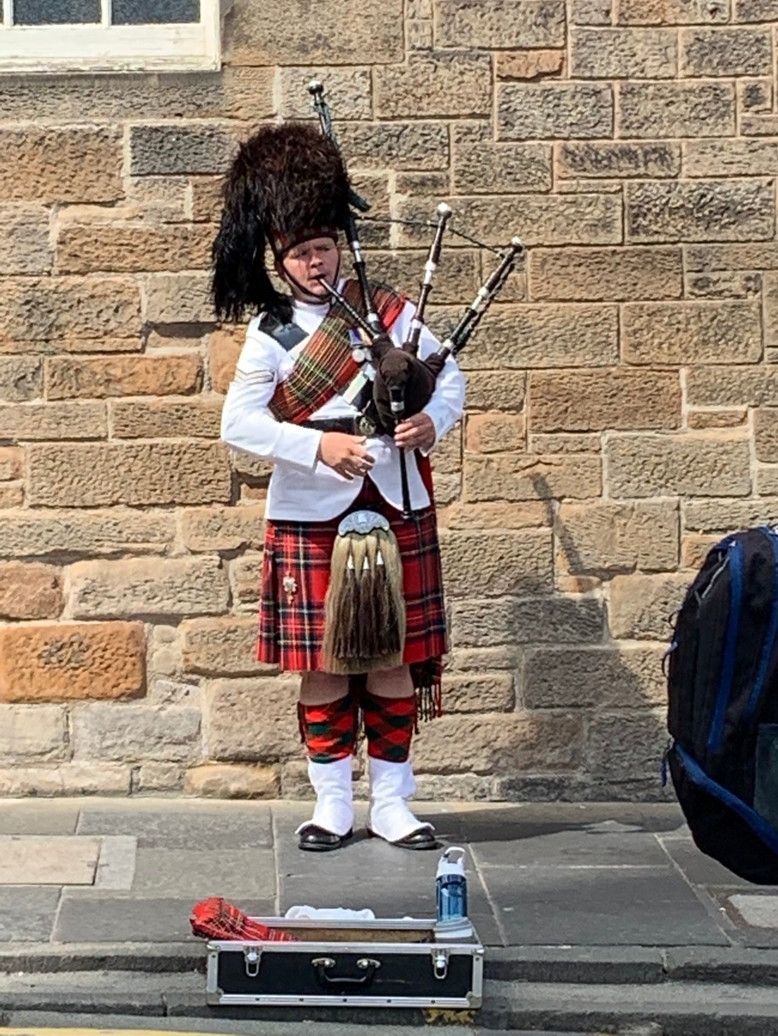 This is one of the many bagpipers who stand on street corners all over Edinburgh playing their bagpipes.