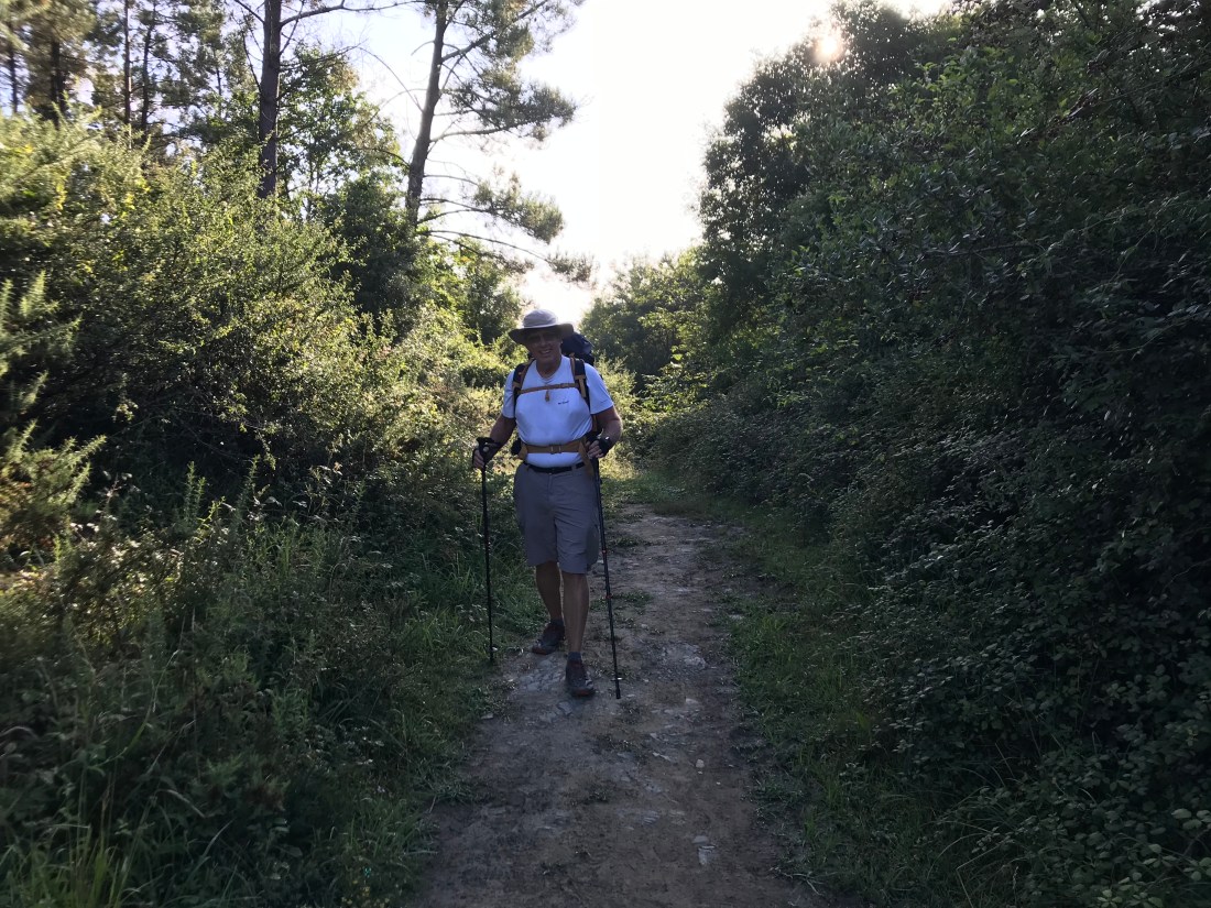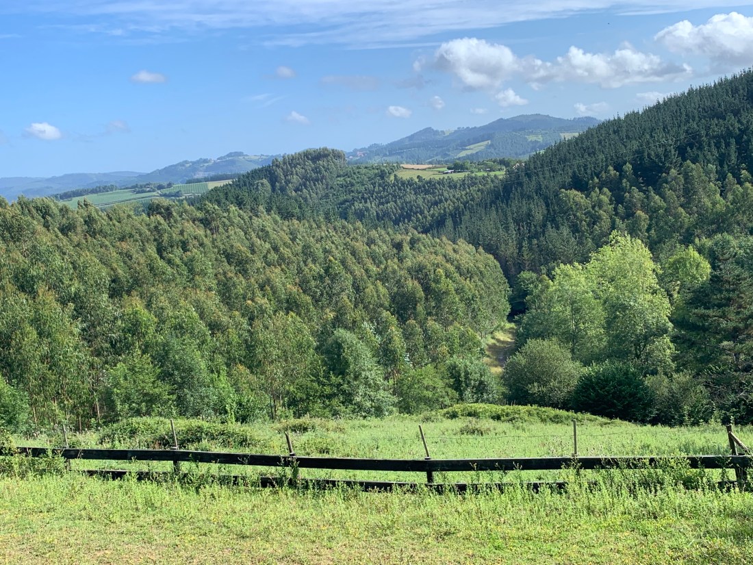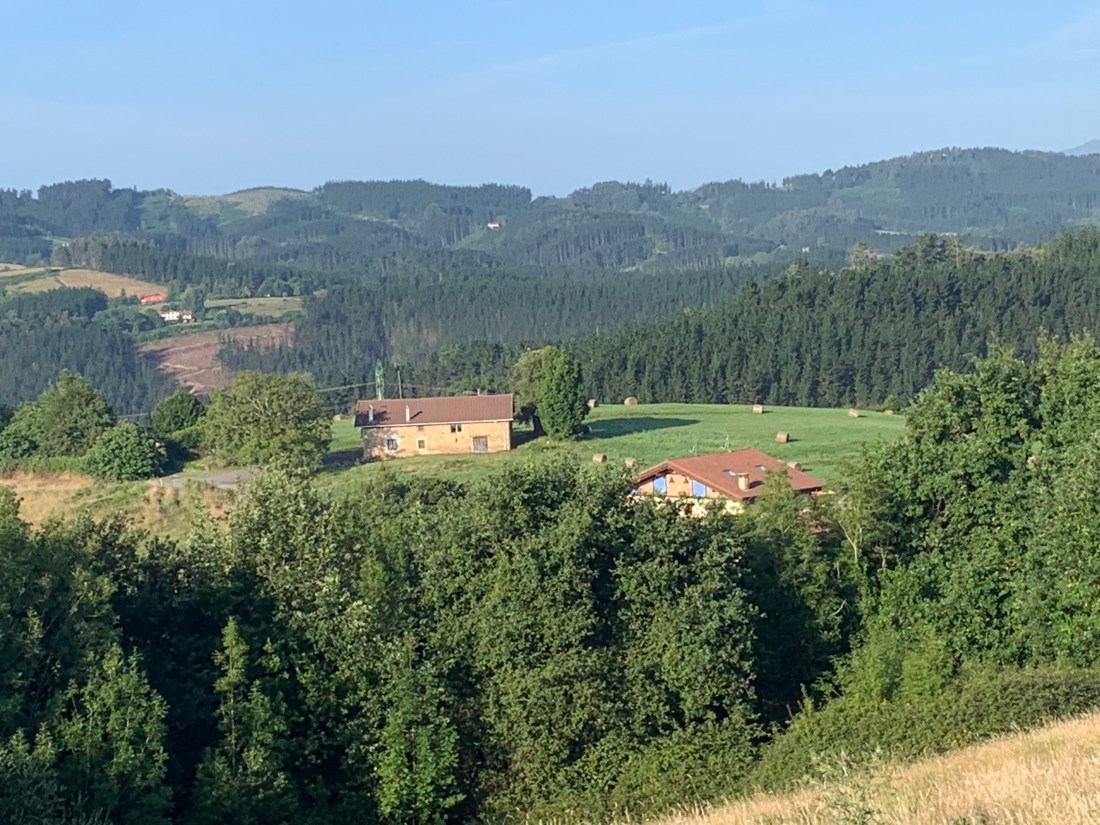 After a fitful night’s sleep in the stiflingly hot alburgue in Guernica, everyone in the bunk room got up at 6:00 AM and was upstairs in the breakfast room at 6:30 anticipating a hearty breakfast. Instead we got crackers and stale bread with butter and jam and orange juice and cold coffee. I stuffed myself with crackers and stale bread slathered with butter and jam and drank a whole carton of orange juice. I was on the road by 7:30.