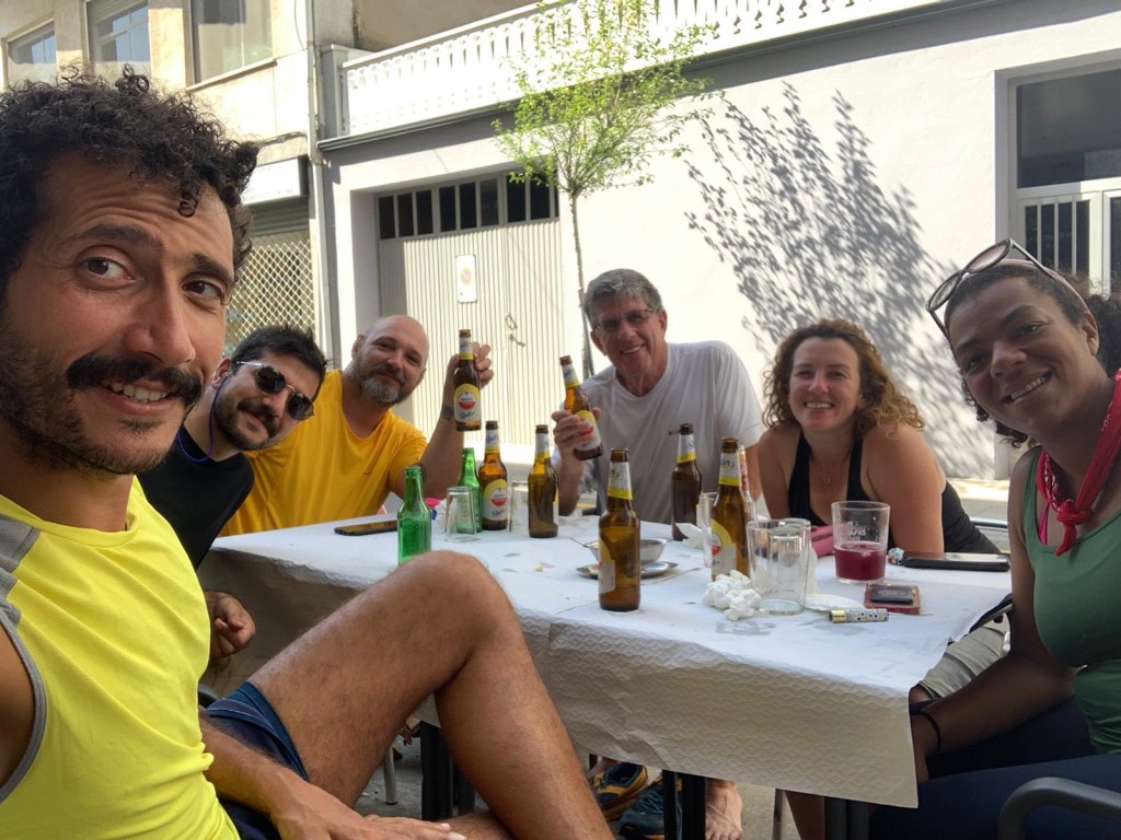 Group picture. Ann from France, Marco from Italy, Teresa from Spain, Tarek from Palestine and now London, Irene from NYC and now London, and seated is Sahand from Iran now London.
