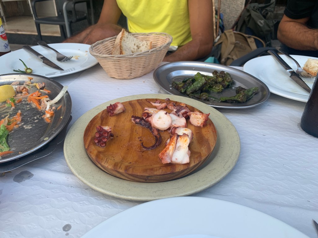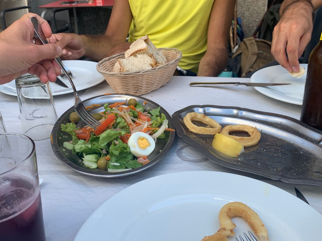 When we got to Arzua we ran across some old guys who recommend a restaurant for a late lunch/early dinner. Everything we ordered we shared. First two courses, mixed salad and calamari. The salad was great, the calamari was only so so.