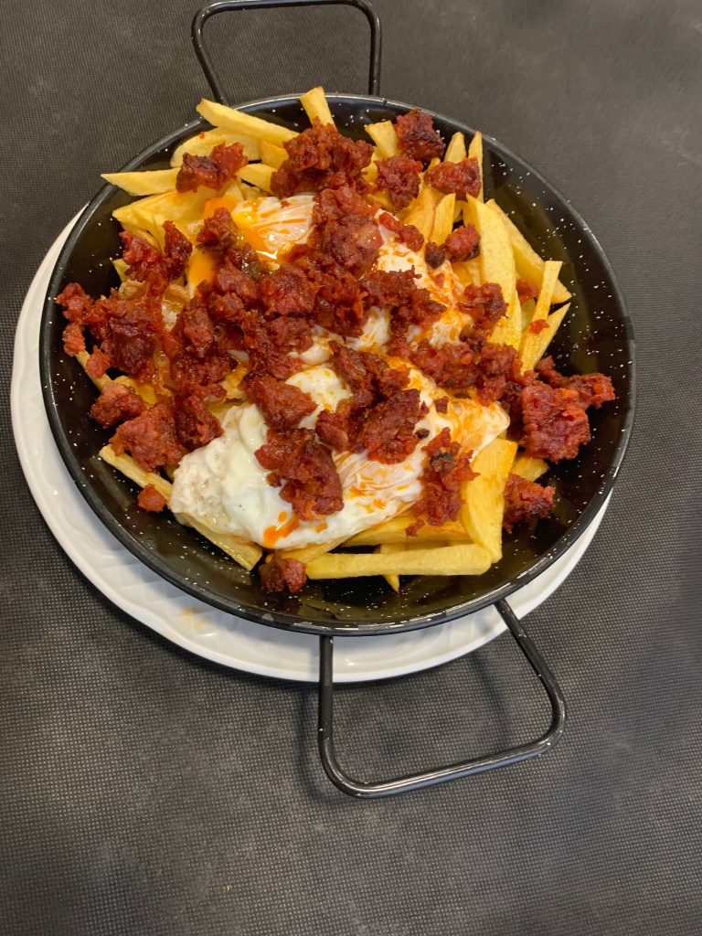 Dinner. Eggs and fries and chorizo. Very salty but very good.
