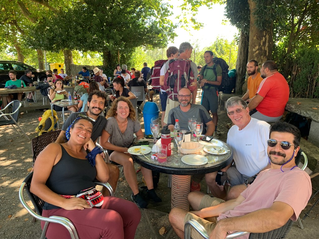 This is the group for our late lunch/early dinner. we will be walking with them to Lavacola tomorrow and then on Monday we will be walking with them into Santiago. Anne from France is sitting next to Irene.