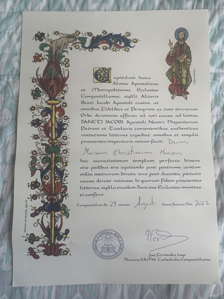 This is a Certificate of Distance. The stamps in your Pilgrim Passport document where you started and then the registrar looks at the chart and figures out the distance you walked.