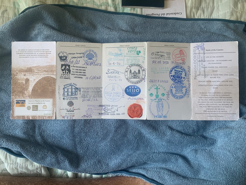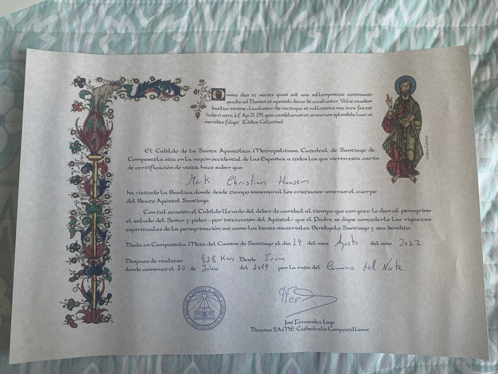 I got credit for walking the entire distance from Irun to Santiago but if you have been following this blog, and you should be following this blog, I used taxis, trains, ferries, and buses to cover some of the distance on my journey along the Norte. Still, I estimate that I walked 650 kilometers of the 828 kilometers on the Norte in 2019 and 2022. Not bad for an old man.