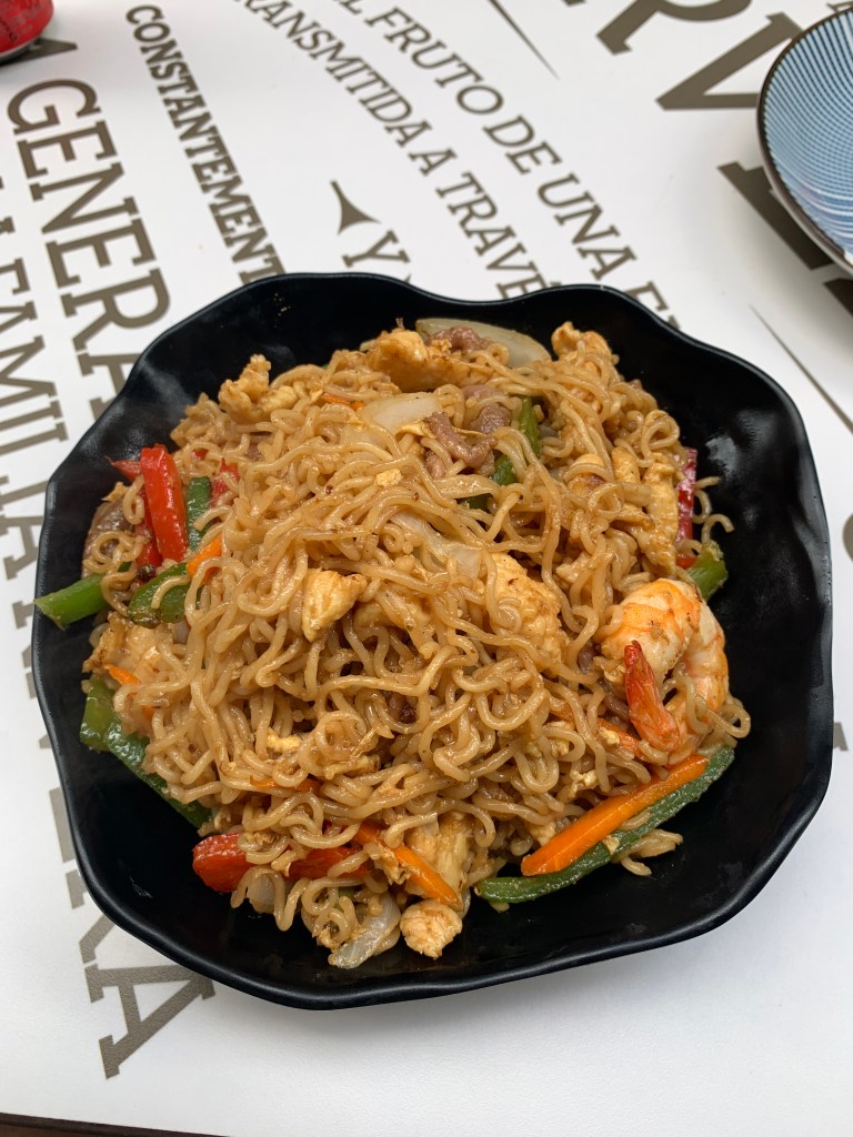 This is my triple delight stir fry. Ángel hair pasta with veggies and chicken, pork and shrimp. It was delicious and with an iced tea the bill came to 7 Euros.