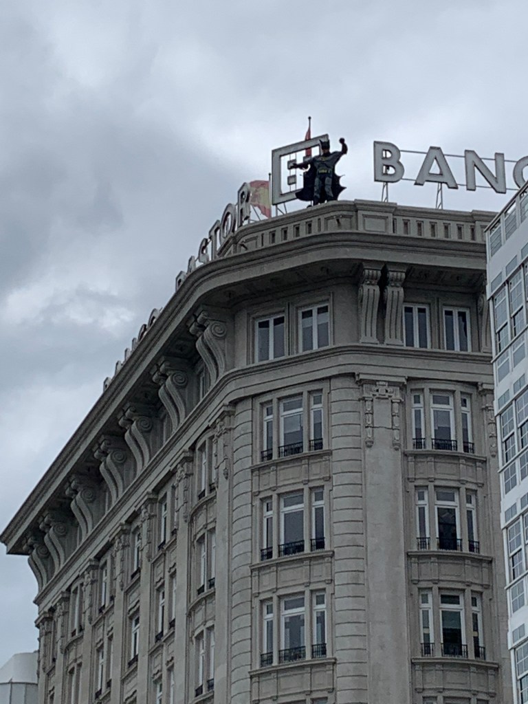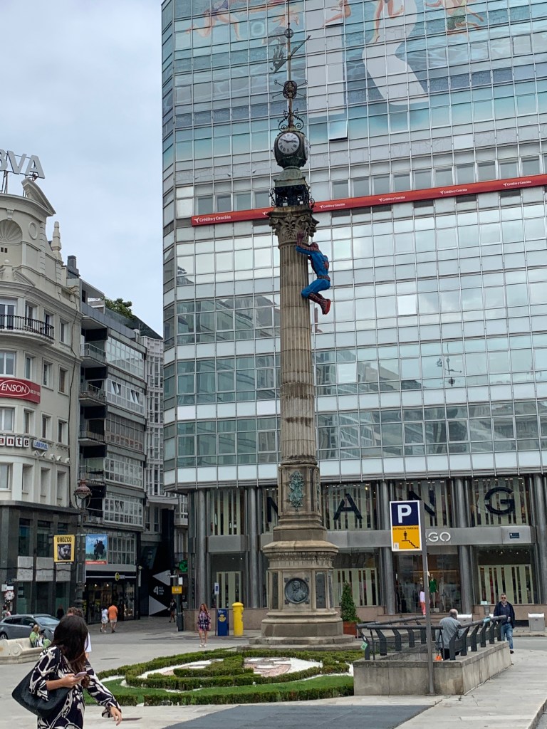 Spiderman climbing an obelisk in downtown A Coruña.