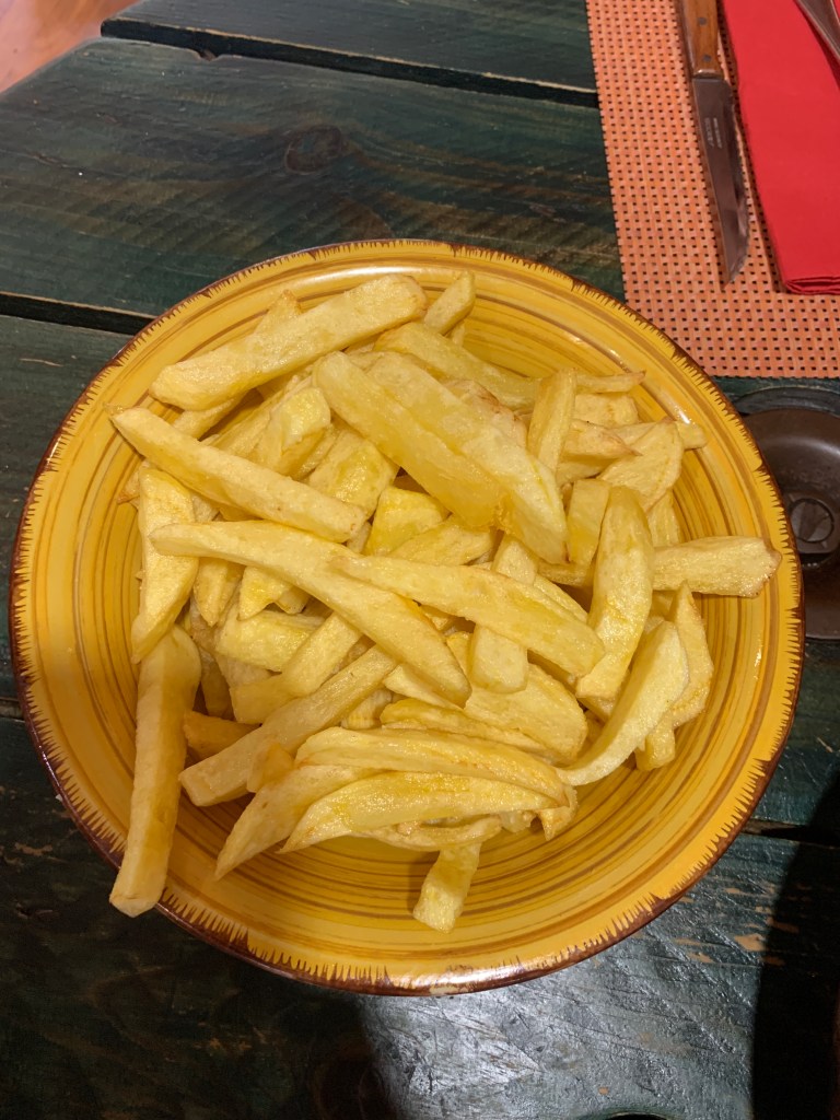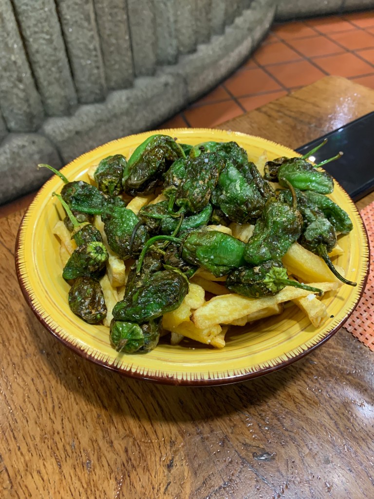 This is our second course. Roasted peppers and fries.