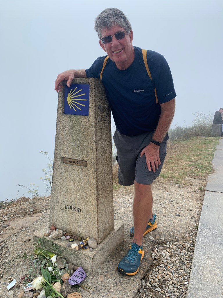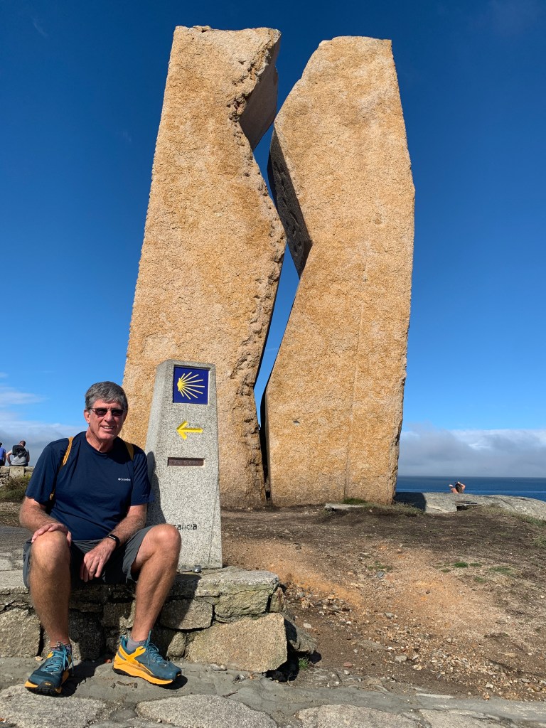 I am sitting next to the zero kilometer marker for the Camino from Santiago to Muxia. In the background is a monument acknowledging all the pilgrims who stopped their journey to help clean up an oil spill about 15 years ago.