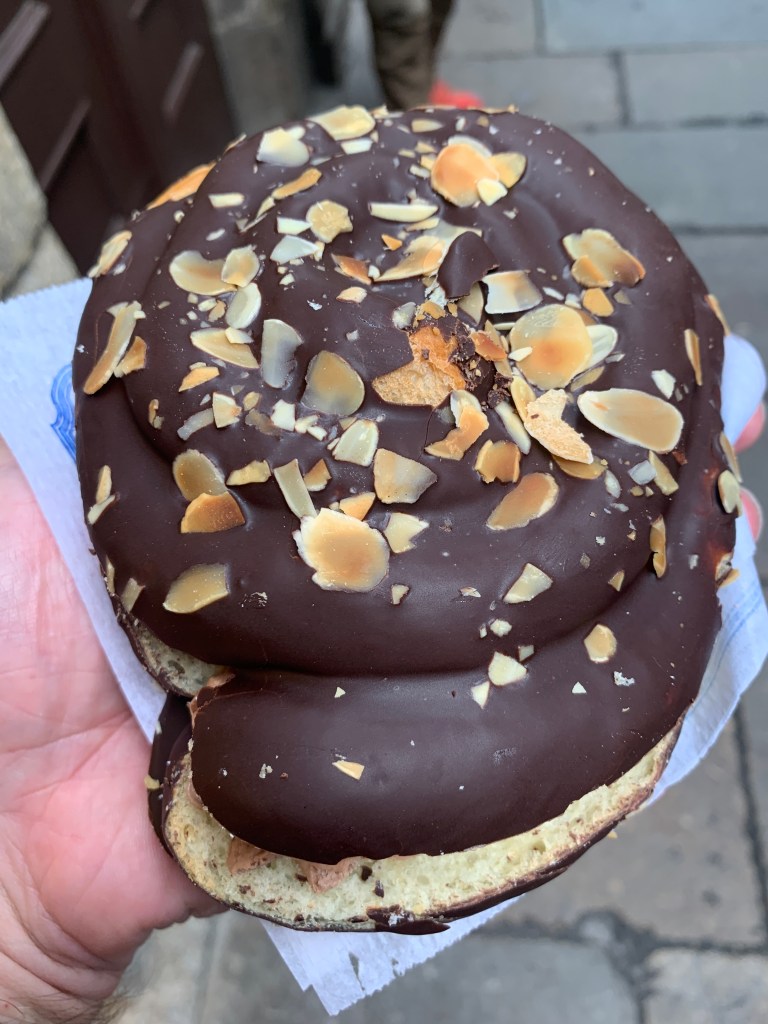 This is breakfast. It is a croissant breakfast sandwich. They split the croissant in half and spread a layer of vanilla cream and a layer of chocolate cream on the two halves. They put the two halves together and cover the whole thing in chocolate and sprinkle it with almonds. It was way beyond delicious.