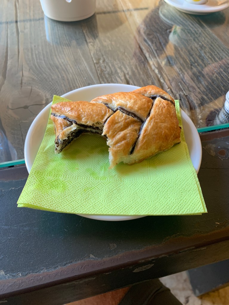 We stopped in a cafe on the town square for breakfast. I had this delicious chocolate croissant and a glass of orange juice.