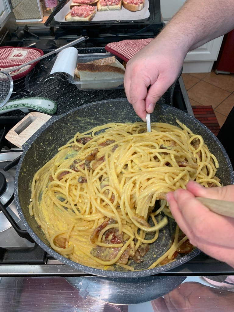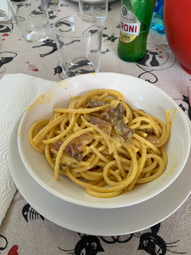 First course was pasta carbonara.