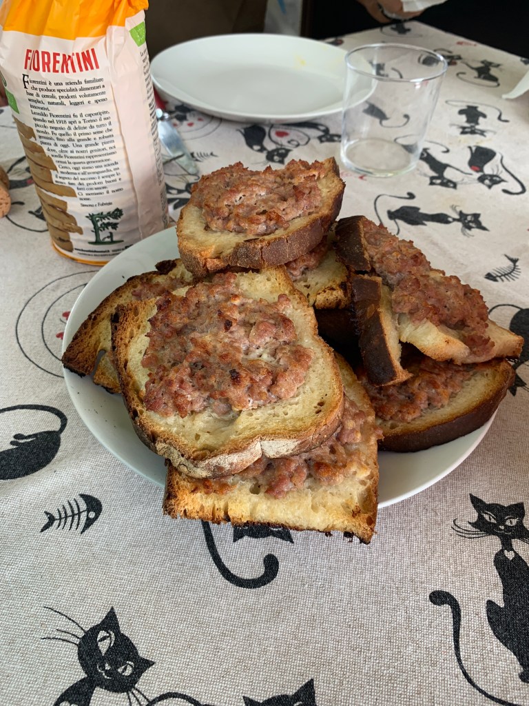 We had salad and then crostini. Crostini is bread topped with a cheese and sausage mixture that is cooked in the oven. It was way beyond delicious.