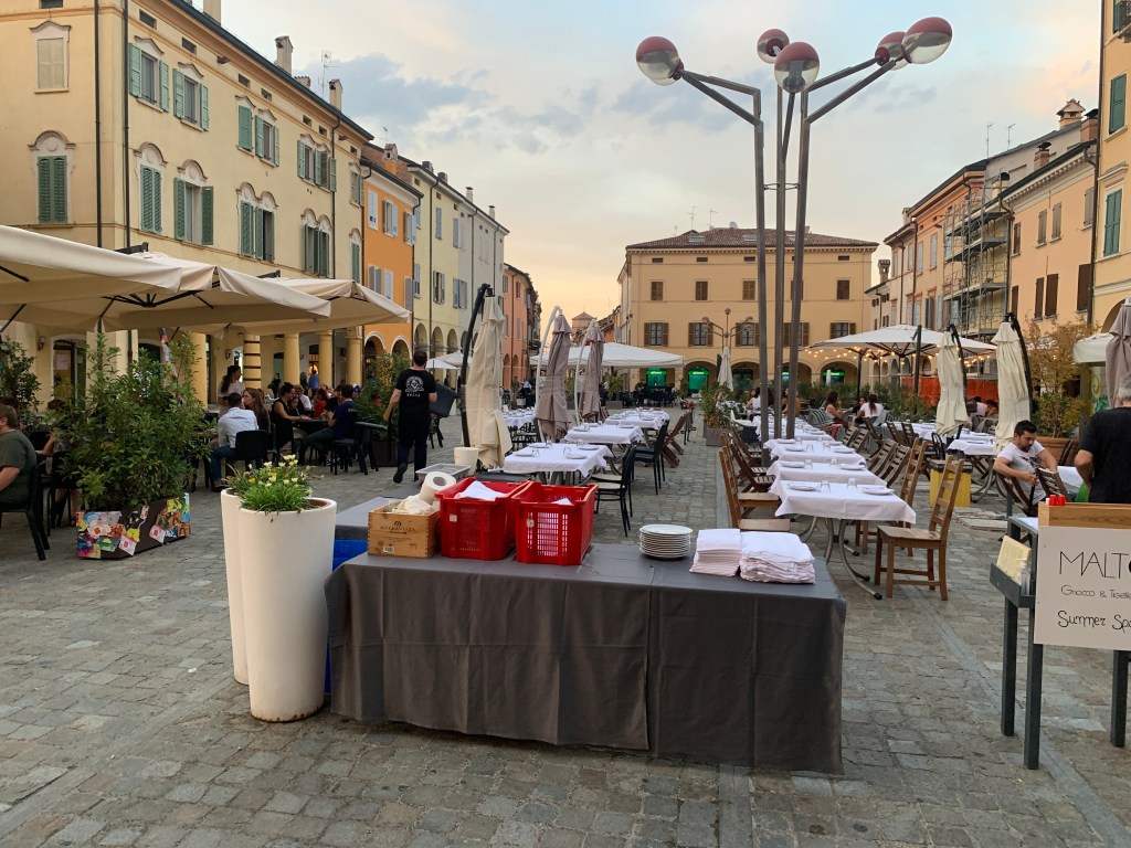 We drove back to Carpi and we are having dinner in the Square.