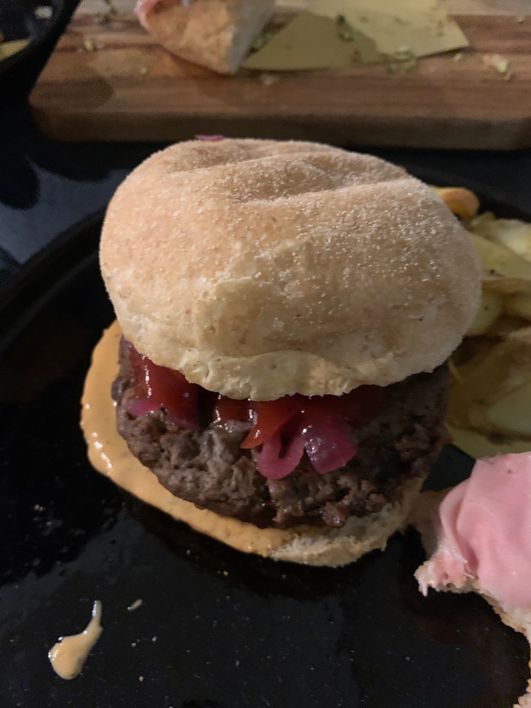 Second course is a hamburger made with pulled pork. Yum