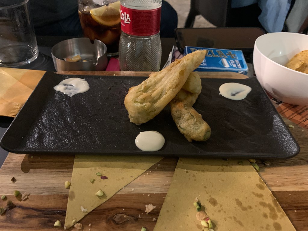 As a third course we had fried zucchini flowers. Very tasty. What a great dinner. I am stuffed.
