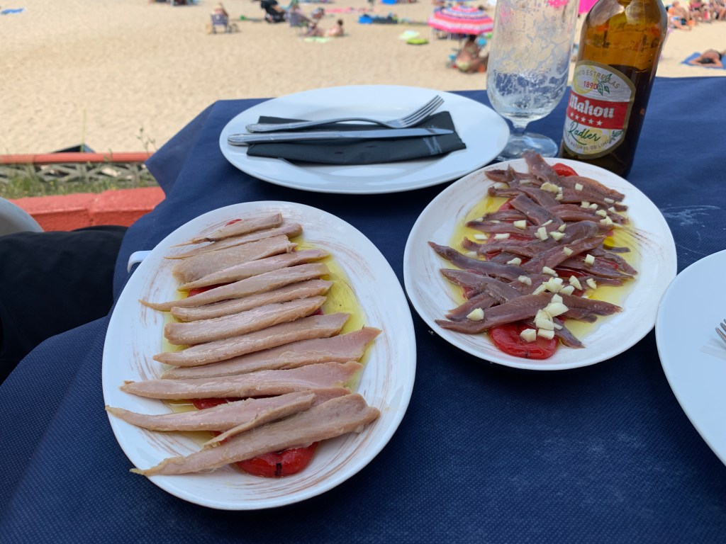 Great lunch at Anna’s Beach. To the right is a plate of anchovies and pimentos and to the left is tuna with pimentos.