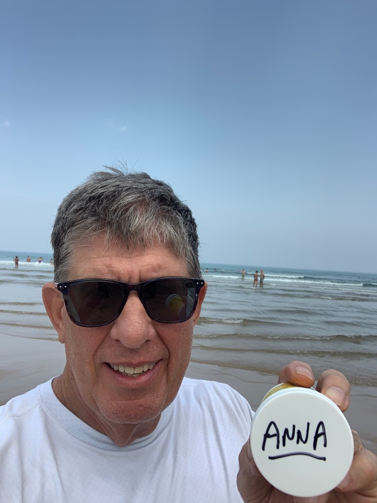 In 2019 I was walking the Camino Del Norte and was having a rest day in Santander when I got a call from my sister Marina who told me Anna would pass away soon. The next morning I was on my way back to my hometown, Springfield, Illinois. By the time I got home Anna had already passed away. Anna loved to travel but wasn’t able to do as much traveling as she would have liked. I have two containers of her ashes with me on this trip. I am going to spread the contents of the first container on a beautiful beach here in Spain, because she loved going to the beach. I put flower seeds in the second container with her ashes and I plan to spread the contents of this container when I walk in Italy in September and October. Anna loved flowers and who doesn’t love Italy. Rest In Peace Anna.