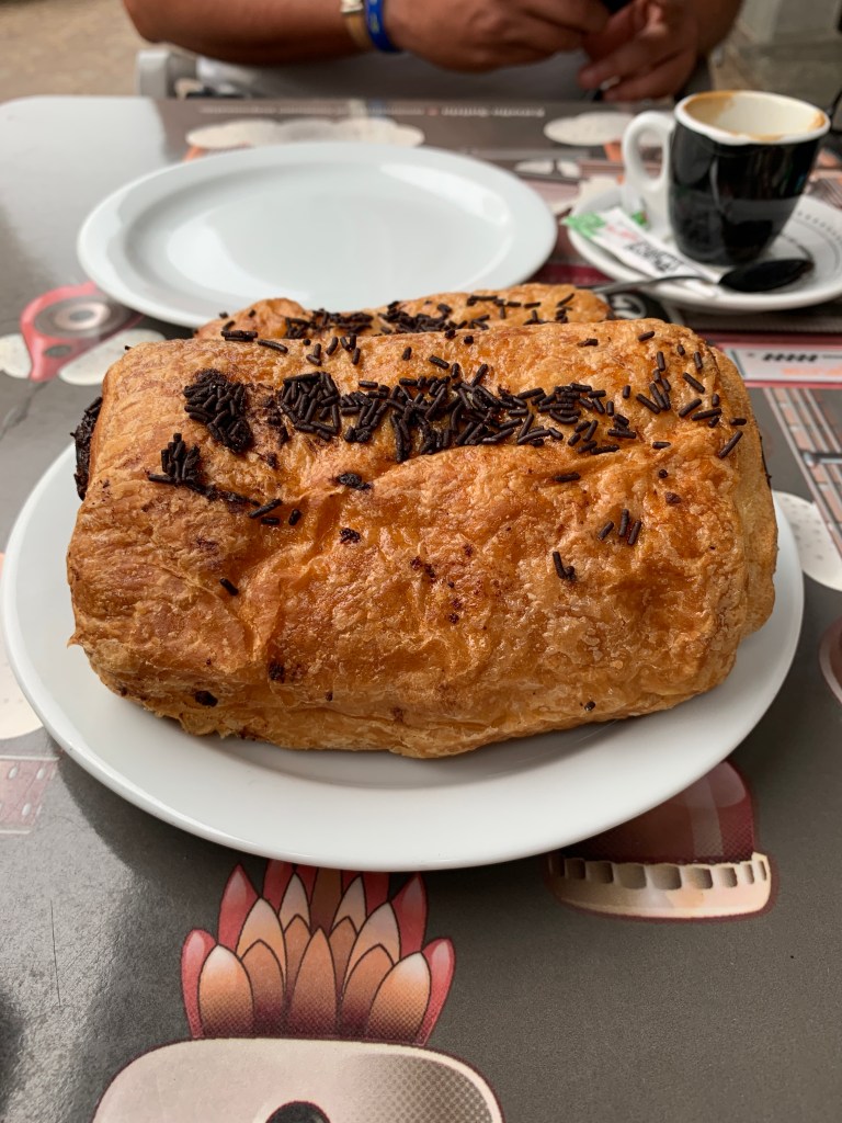On my prior Caminos I became addicted to chocolate croissants. We stopped for a mid morning breakfast break and I had a scrambled egg and Serrano ham pintxo and my first, but not last, chocolate croissant on this Camino.