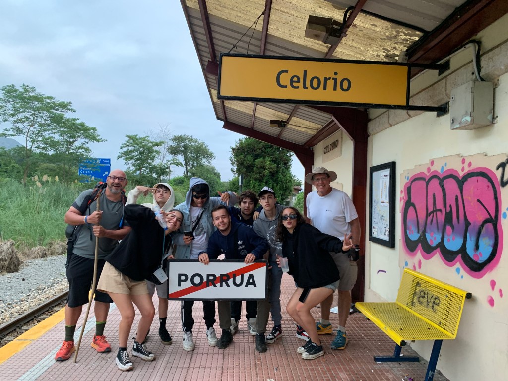 The plan was to catch a train at the Celorio train station and ride it to Ribadesella. The train was scheduled to arrive at Celorio at 7:20 AM. We got to the train station at 7:00 AM and spent some time with these teenage revelers.