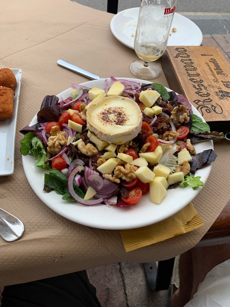We could not find a place to stay in Ribadessella so we took a cab to Cangas de Onis and checked into a hotel to give Marco a chance to rest and recover from his sunburn and heatstroke. Dinner tonight was delicious. I had a huge fresh salad.
