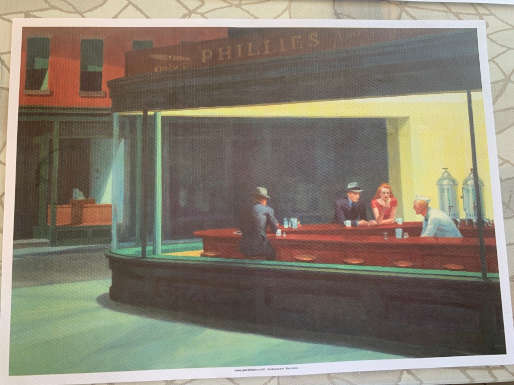 As the waiter put this placemat down on the table in front of me I commented, in my fractured Spanish, that I loved this Edward Hopper painting. I have a print in my living room. I told him I saw the original at the Chicago Art Institute. He said that was impossible because this painting is hanging in a museum in Madrid. I googled it and showed him that this painting is on permanent display at the Chicago Art Institute. He looked down his nose at me and insisted that I was wrong and that this painting is in Madrid. I gave up arguing with this guy and ordered a bocadillo.