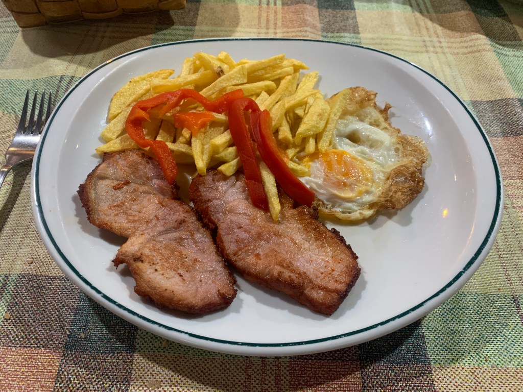 Second course was pork, fries and a fried egg.